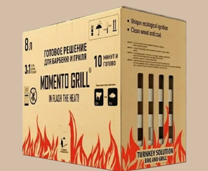 Удобный и продуманный набор MOMENTO GRILL 4-в-1 — это готовое решение для быстрого розжига барбекю и гриля. В одной коробке собрано всё, что нужно, чтобы без усилий разжечь мангал и приготовить угли всего за 10 минут. Набор включает дрова, уголь, средство для розжига, опахало и спички. Достаточно поджечь коробку — и она самостоятельно разгорается, обеспечивая ровное и быстрое разжигание угля.
